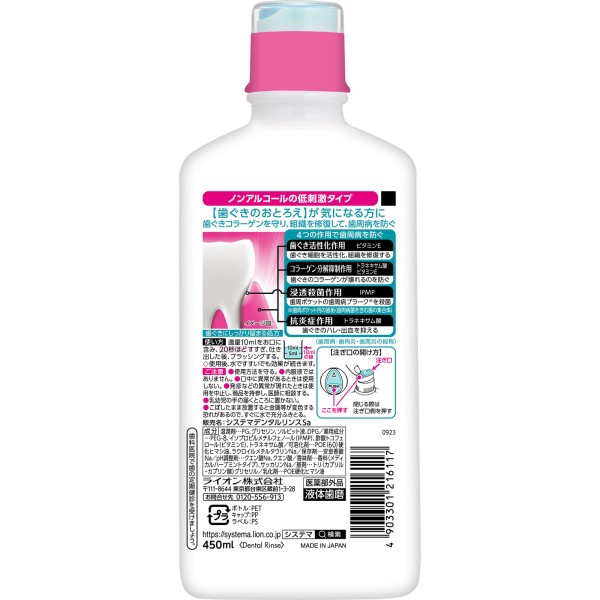 시스테마 잇몸 플러스 덴탈 린스 논알코올 마우스워시 450ml 라이온 > 치주병 예방