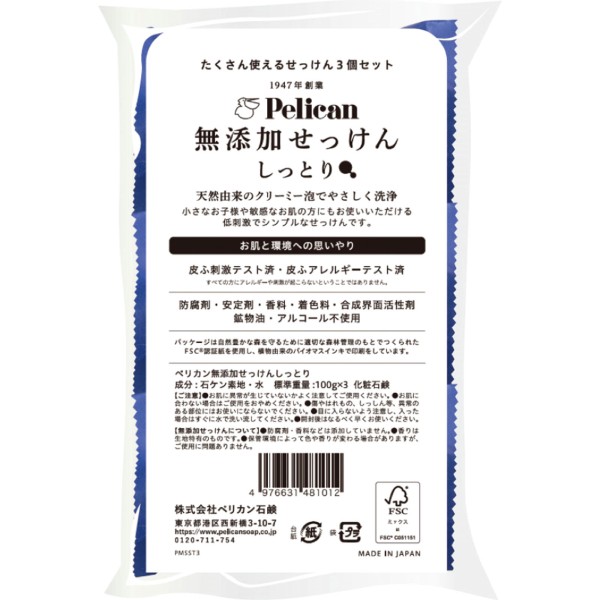 「防腐剤安定剤」「香料」「着色料」「合成界面活性剤」「鉱物油」「アルコール」不使用で小さなお子様や敏感なお肌の方もお使いいただける低刺激でシンプルな釜焚きせっけんです。天然由来のクリーミーな泡でしっとりとした洗い心地。「皮膚刺激テスト済」「皮膚アレルギーテスト済」※すべての方に刺激やアレルギーがないということではありません。パッケージはFSC認証紙を使用し、お肌にも環境にも配慮しています。また、食品包装にも用いられるバリア性に優れた紙ピローを使用し、せっけんの品質を保持しています。たくさんお使いいただける3個セットです。