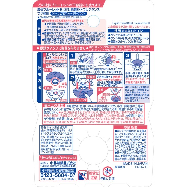 리퀴드 블루렛 두는 것만으로 제균 EX 프레그런스 교체 클린&아로마 워터리 플라워 67ml 고바야시제약 > 변기 탱크용 액체