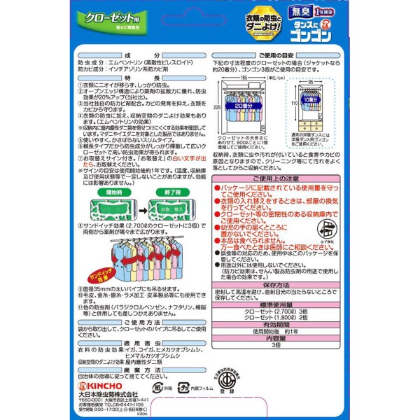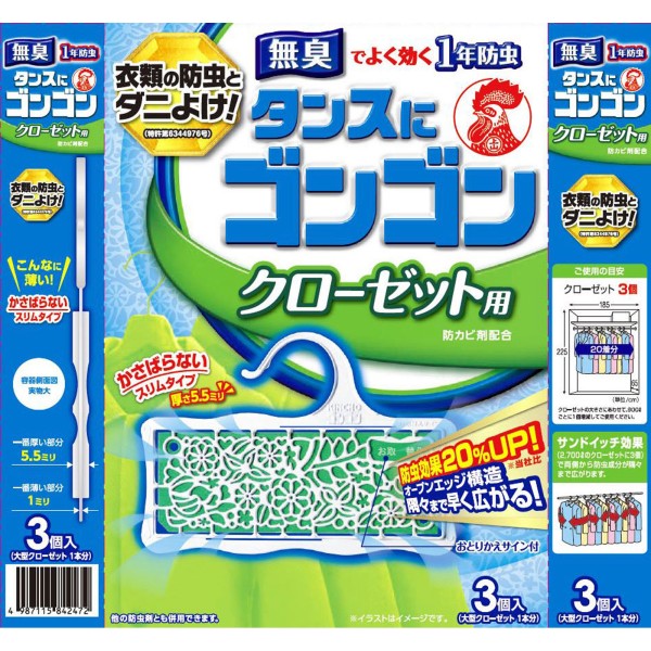 옷장에 곤곤 의류 방충제 클로젯용 무취 (1년 방충·방곰팡이·진드기 퇴치) 3개 다이니폰 제충국 > 무향 1년용