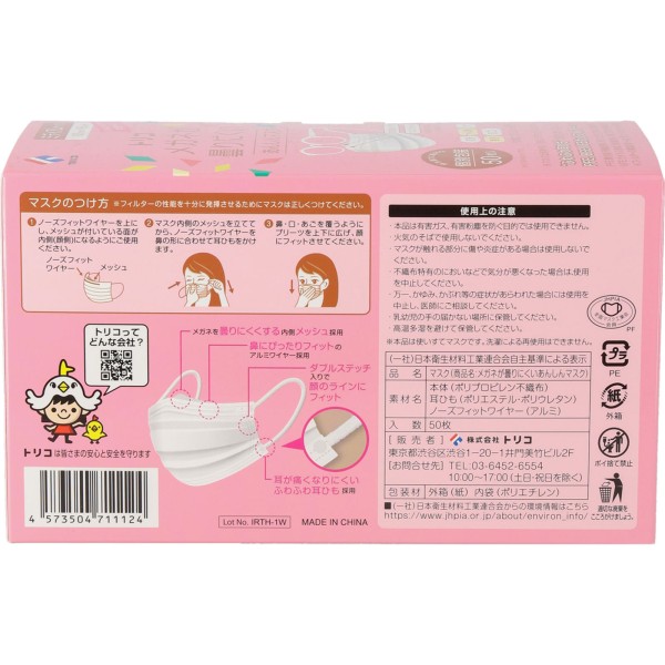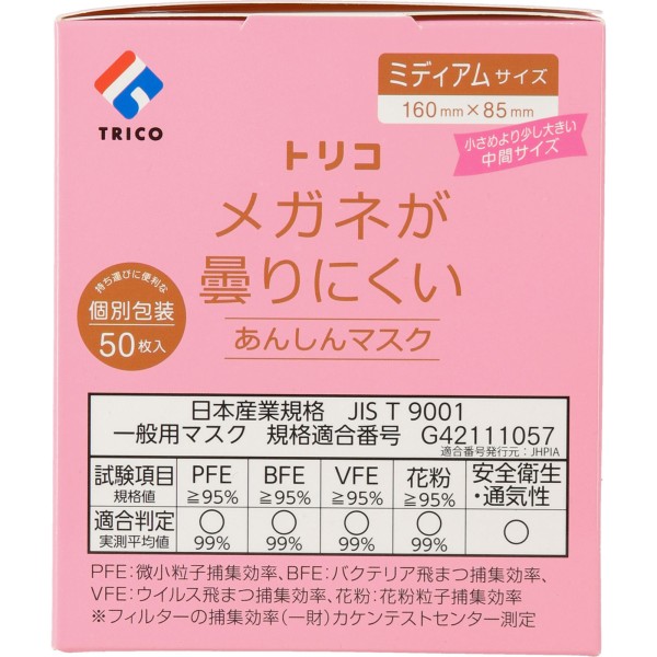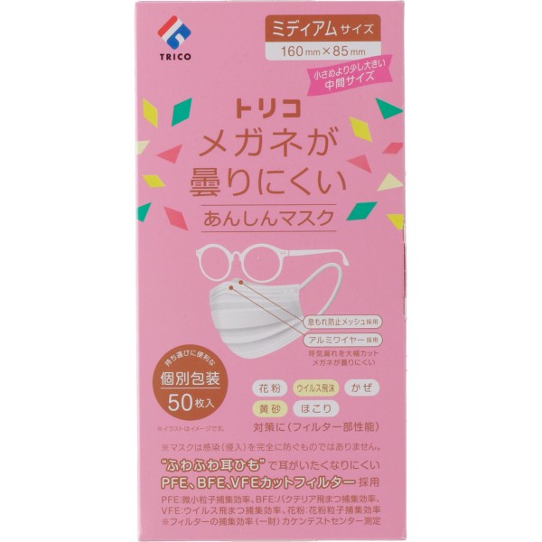 ●【メガネが曇りにくい】 →アルミワイヤーのフィット感と内側メッシュでメガネがくもりにくい ●ミディアムサイズ 小さめサイズとふつうサイズの中間サイズ 160mm×90mm●【ふわふわ耳紐で痛さ軽減】 →丸ゴム4mmふわふわタイプ ●【高いフィルター性能】 →BFE/PFE/VFE:99%以上カット PM2.5対応 ●【親水性不織布使用】 →親水性不織布使用。呼気や気温差によるジメジメ感は軽減され、マスク内をサラサラに保ちます。 ●【顔にフィットするステッチ入り】 →目立たずフィットする形状のステッチでピッタリフィット! ●【アルミワイヤー採用】 →ノーズワイヤーにフィット力抜群のアルミワイヤーを採用。 ●【清潔個包装】 →個包装で持ち運びも安心・安全・衛生的! ●【インテリア映えするパッケージデザイン】 →お菓子風のインテリア映えするカワイイデザイン!