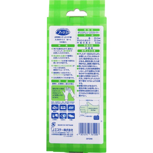 패밀리 요리에 딱 맞는 장갑 ML 사이즈 반투명 100매 에스테 > 폴리에틸렌
