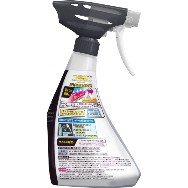 浴そうの頑固汚れまで、シャワーの水圧だけでこすらずに落とせるおふろ用洗剤 ●浴そうにシューーーッとかけて60秒後に流すだけで、翌日までお湯を放置したザラザラ汚れや、湯抜き後時間が経ったカピカピ汚れ、くり返し入浴のたっぷり汚れなど、頑固汚れもこすらずに洗える。 ●高濃度洗浄成分を配合。 ●ウイルス除去もできる。