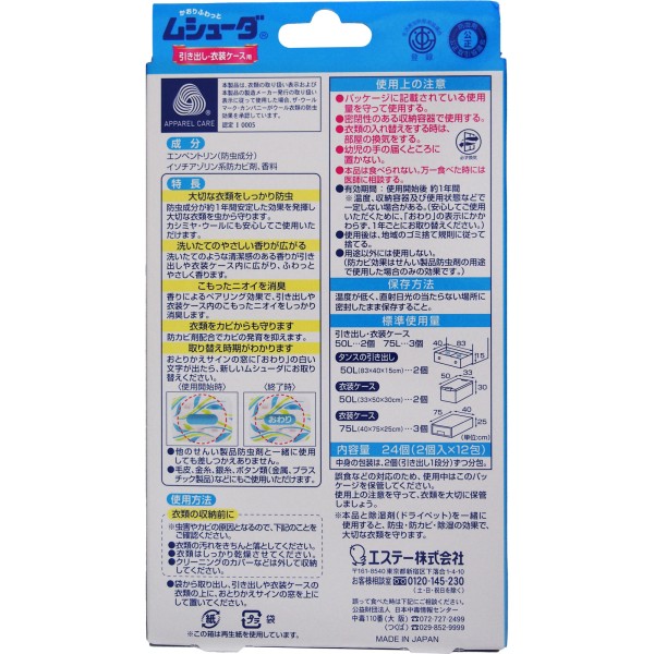 무슈다 1년간 유효 서랍·옷장 케이스용 마일드 소프향 24개 에스테 > 향기 1년용