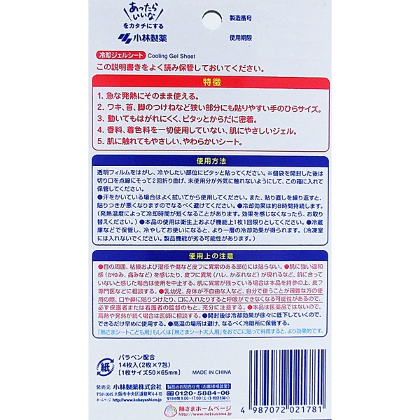 몸에 붙이는 열내림 시트 14매 고바야시제약 > 열 냉각 시트