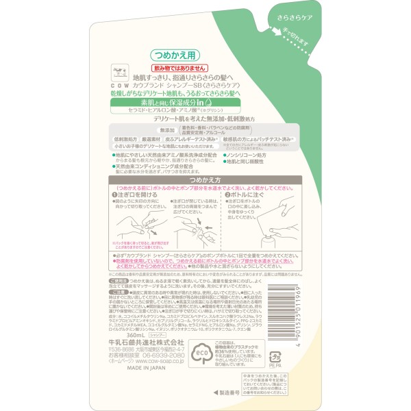 카우브랜드 무첨가 샴푸 사라사라 케어 리필 360ml 규슈 비누 > 카우 브랜드