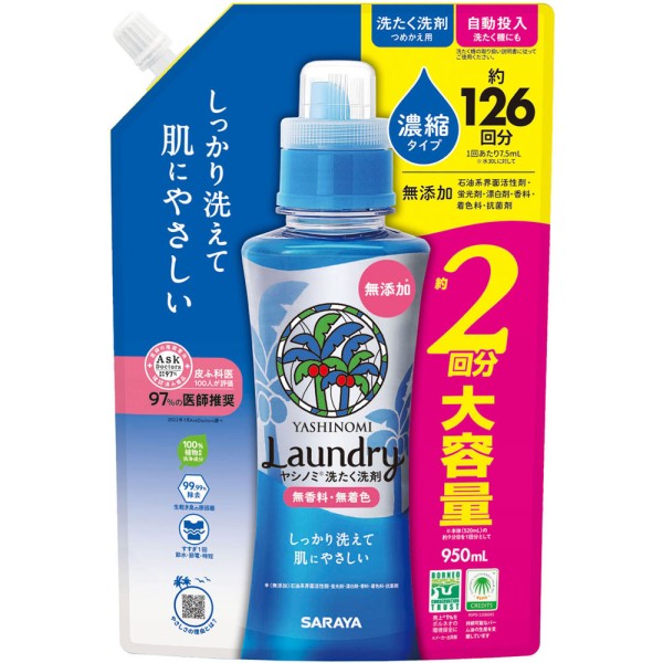 야시노미 세탁 세제 농축 타입 리필 950ml 사라야 > 액체 세제