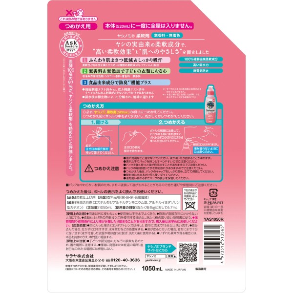 야시노미 유연제 리필 1050ml 사라야 > 액체 세제
