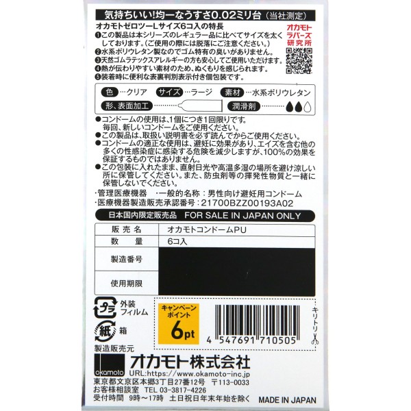 제로투 L 사이즈 클리어 6개 오카모토 > 1개 팩