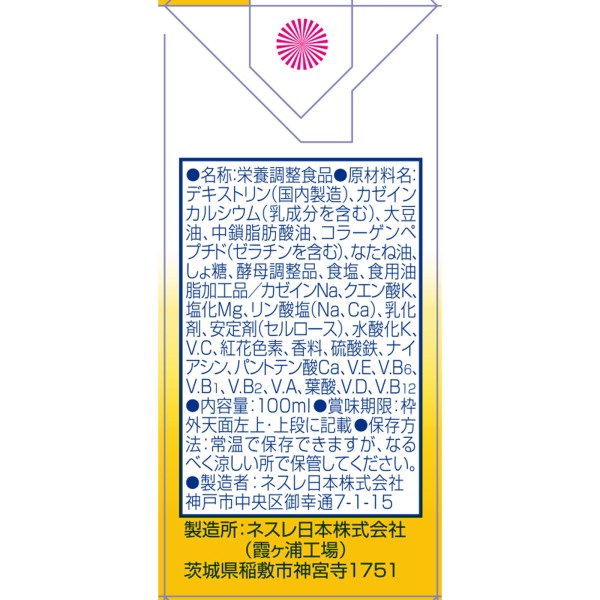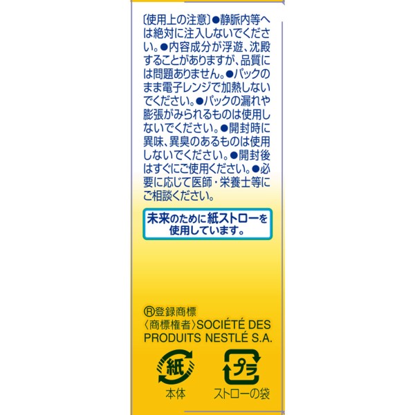 1パック100mlで200Kcal・たんぱく質8g。少量高カロリーの栄養補助飲料です。多くの医療機関・介護施設でご使用いただいております。