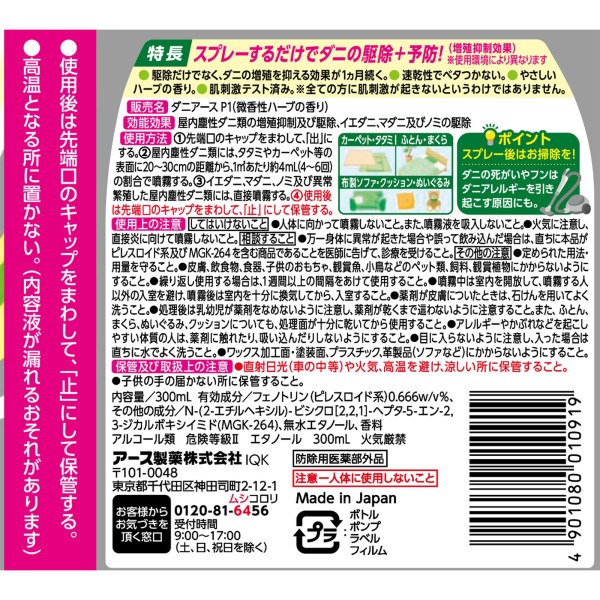 다니 어스 스프레이 허브향 침구 소파 진드기 대책 제균 소취 300ml 어스제약 > 포획·구제