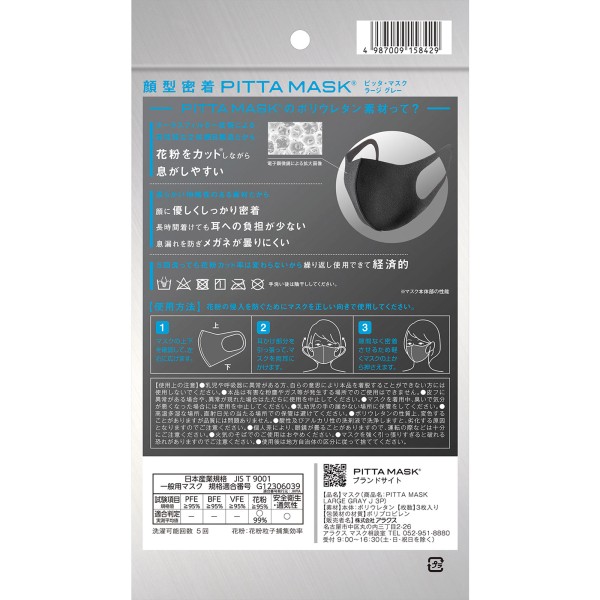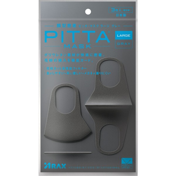 これまでサイズが合わず使えなかった方に待望のラージサイズが登場しました。スタイリッシュなダークトーンがコーディネートのアクセントに。汚れも目立ちにくいです。ポーラスフィルター技術による高性能な立体網目構造だから、花粉をカットしながら息がしやすいです。柔らかい伸縮性のある素材だから、顔に優しくしっかり密着し、長時間着けても耳への負担が少ないです。また、息漏れを防ぎ、メガネが曇りにくいです。5回洗っても花粉カット率が変わらないから、繰り返し使用できて経済的です。花粉だけでなく、有害な紫外線もカットします。UVカット率/UPF:97パーセント/50+。JIS T 9001適合。