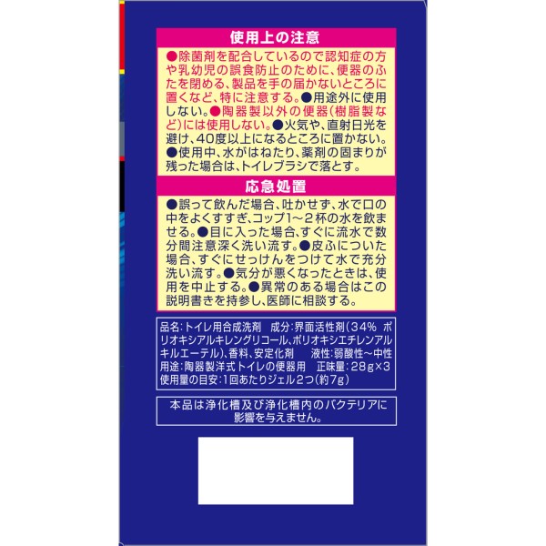 便器表面に貼るだけで、心地よい香りが広がり、水ぎわのキレイを保つ●流すたびに薬剤が広がり洗浄する●除菌*成分により水ぎわの黒ズミ発生を抑える*黒ズミの発生原因になる菌の繁殖を抑えるただし、すべての菌を除菌するわけではない 使用環境・汚れの程度により、効果が異なることがある●左右2か所に貼ることで効果を発揮●約1週間持続(気温・水温・水量などにより、多少変化する)●流れる水は無色