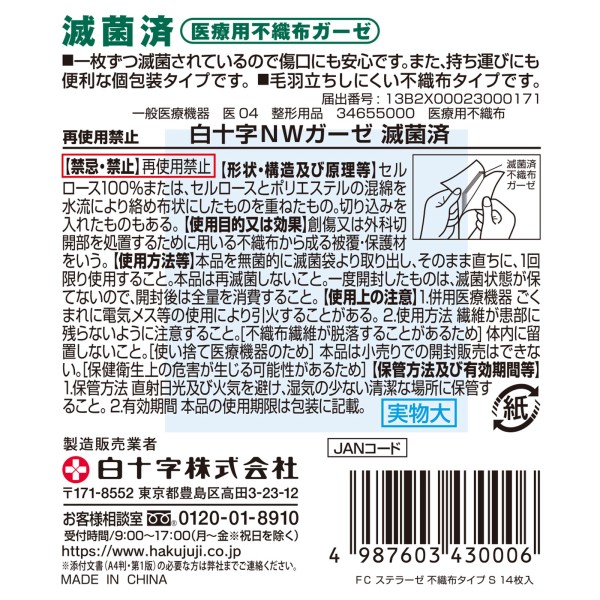 FC 스텔라제 부직포 타입 S 14매입 백십자 > 거즈