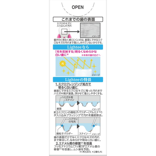 光発想で生まれた「Lightee[ライティー]」はミクロクレンジング処方により光を反射する明るく白い歯にし、顔の印象まで明るく見せる美白ハミガキミクロクレンジング処方で、歯の表面にできるミクロなキズに残った着色汚れまで徹底除去。