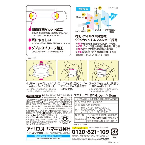 일회용 마스크 소형 7매 아이리스오야마 > 플리츠