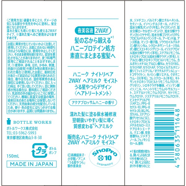허니크 나이트 리페어 2WAY 헤어 밀크 모이스트 우루성 야쓰라 디자인 150ml 보틀웍스 > 기타 헤어 오일·리퀴드