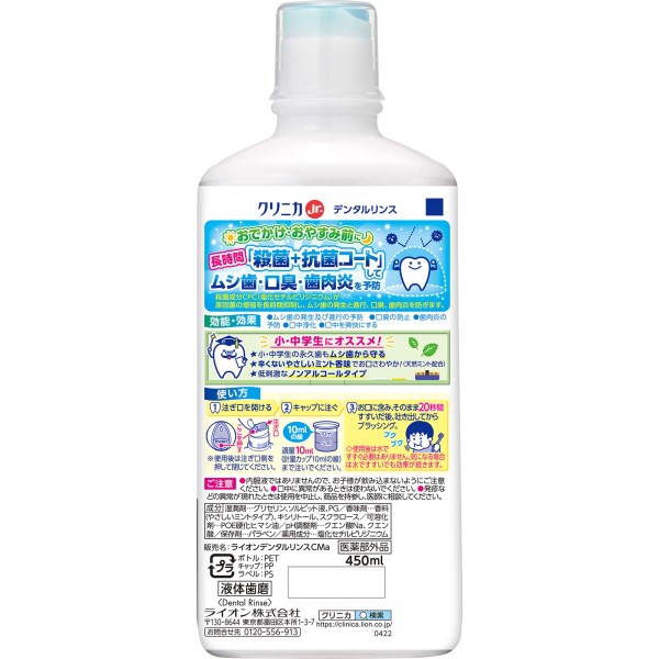 클리니카 Jr. 덴탈린스 부드러운 민트향 마우스워시 450ml 라이온 > 충치 예방