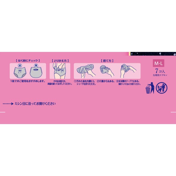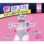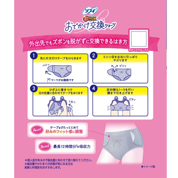 おでかけ交換ショーツはズボンを脱がずに交換できるから、外出中でも簡単にはけるショーツ型ナプキンで、安心したまますごせます。
