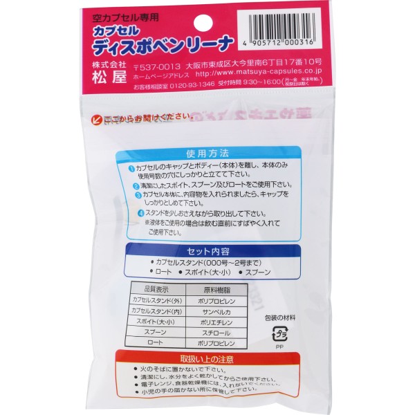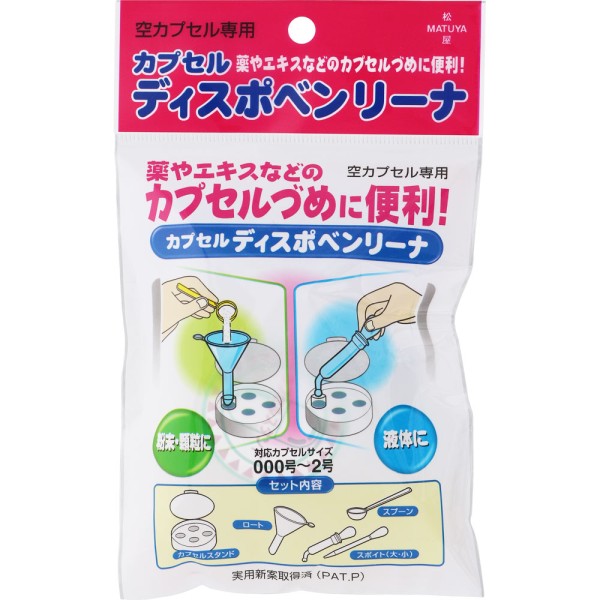 「松屋 カプセルディスポベンリーナ」は、カプセルに粉末や液体を詰める事に便利な道具のセットです。カプセルサイズ:000号~2号に対応しています。小さく軽量ですので持ち運びに便利です。液体を飲む際は必ず飲む直前に充填作業を行ってください。スポイト・ロート・スプーン付きです。