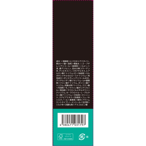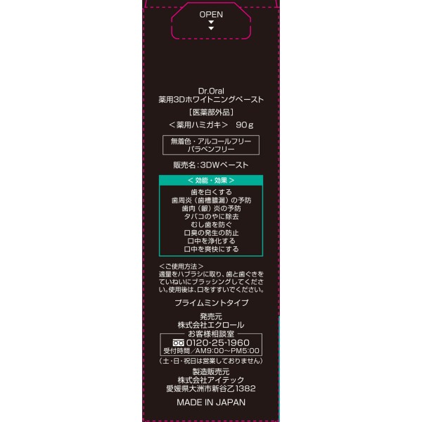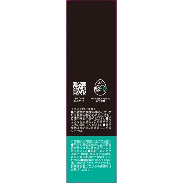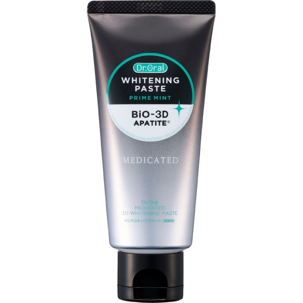 美白※1と歯周病※2予防の同時ケアができる、独自成分「バイオ3Dアパタイト※3」と有効成分「グリチルリチン酸ジカリウム」「ポリエチレングリコール400」を配合した薬用ペーストハミガキです。香味は、厳選3種の天然由来ミント※4をブレンドした爽やかなプライムミントタイプになります。