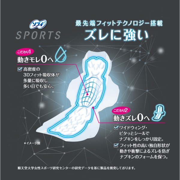 最先端フィットテクノロジー搭載、ズレに強いナプキン。3Dフィット吸収体が多量に吸収するので、多い日の動きモレも安心。更に、フィット性の高い独自形状が動きや衝撃によるズレを防ぎ、ナプキンのフォームを保つので動きズレにも対応。日常シーンからスポーツシーンまで使えます。