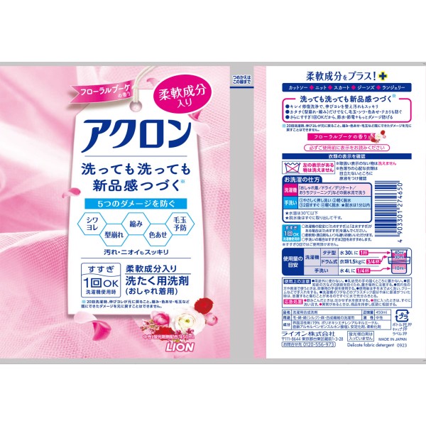 아크론 고급 의류 세제 플로럴 부케 향 본체 450ml 라이온