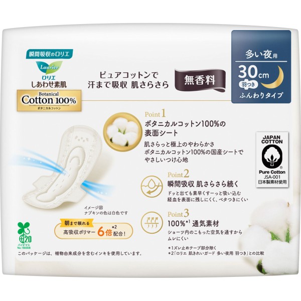 로리에 행복한 피부 Botanical Cotton 100% 많은 밤용 30cm 날개 있음 9개 카오 > 로리에 시아와세 소하다