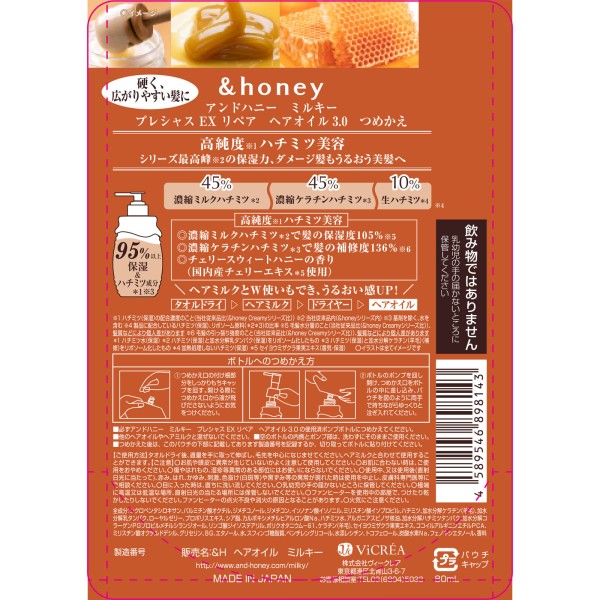 앤드허니 밀키 프레셔스 EX 리페어 헤어오일 3.0 리필 80ml 주식회사 V크레아 > 앤드허니
