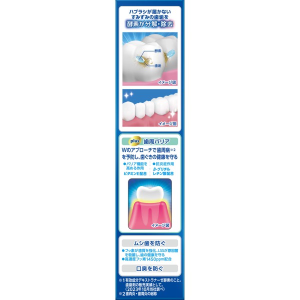 お口の様々なリスクの原因「歯垢」を、日本で唯一、分解・除去できる有効成分「酵素(デキストラナーゼ)」配合。