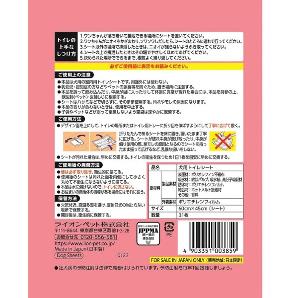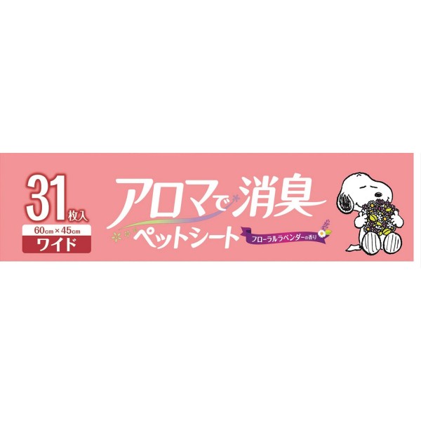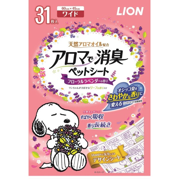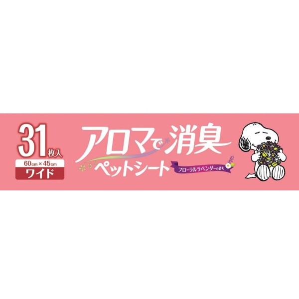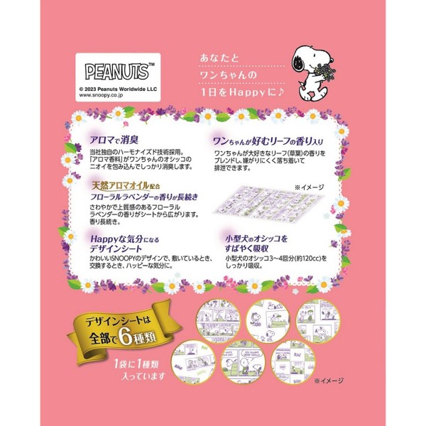 小型犬のオシッコをすばやく吸収します。天然アロマオイル配合のフローラルラベンダーの香りでしっかり消臭し、香り長続きします。ワンちゃんが好むリーフの香り入りです。かわいいSNOOPYのデザインシートで、敷いているとき、交換するとき、ハッピーな気分に。