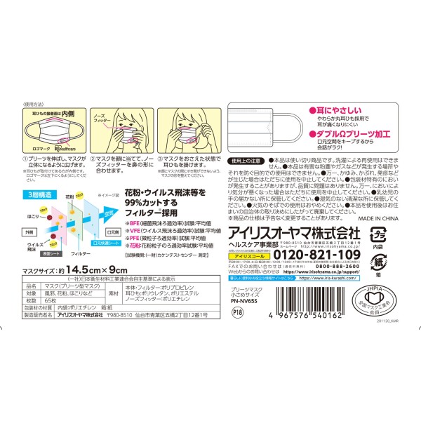 플리츠 마스크 소형 65매 아이리스 오야마 > 대용량