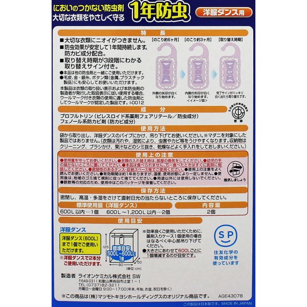 MK 냄새가 안 나는 방충제 1년 방충 옷장 2개분 라이온 케미컬 > 무향 1년용