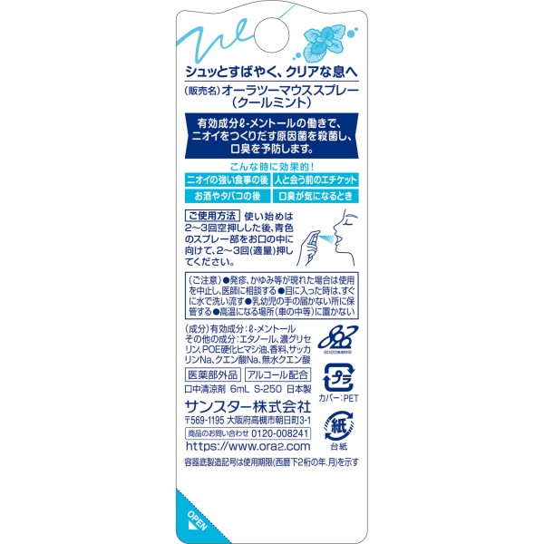 오라 투 브레스파인 마우스 스프레이 [쿨 민트] 6ml 썬스타 > 구강 청량액·스프레이