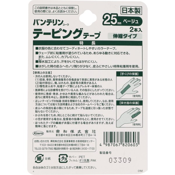반테린코와 테이핑 테이프 25mm 베이지 코와 > 테이핑 테이프 고정