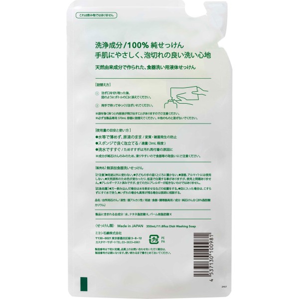 무첨가 식기 세정 비누 리필용 스탠딩 타입 350ml 미요시 비누 > 액체 세제