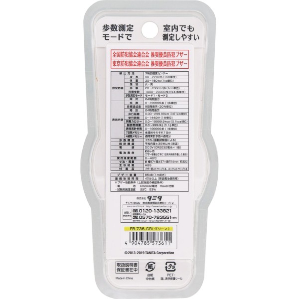 3D 센서 탑재 만보계 [방범 부저 포함] FB-736 그린 타니타 > 만보계