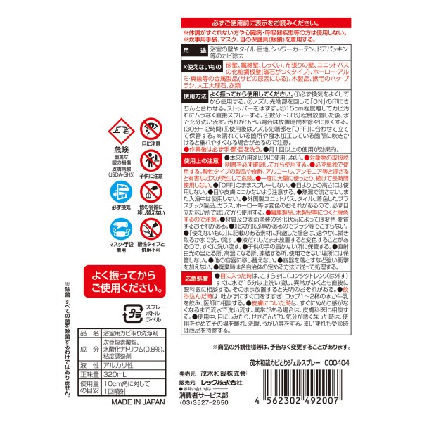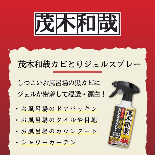テレビやネットでお馴染み、洗剤のエキスパート「茂木和哉」が開発した、カビ取りジェルスプレー。スプレーすると、ジェル状薬剤が壁面に密着し、しつこいカビに浸透、剥がして落とします。垂直面の壁にスプレーしても垂れずに密着するので、効果的にカビを落とします。カビ取り液体スプレーの手軽さと、チューブ式カビ取りジェルの強力効果。それぞれの良いところを合わせた、カビ取りの決定版です。浴室の壁やタイル目地だけでなく、シャワーカーテンやドアパッキン等のガンコなカビを落とします。カビに直接スプレーして、数分~30分ほど放置した後に水で流すだけです(汚れがひどい場合は30分~2時間放置してください)。特殊ノズルを採用しているので、つまらず使い切ることができます。