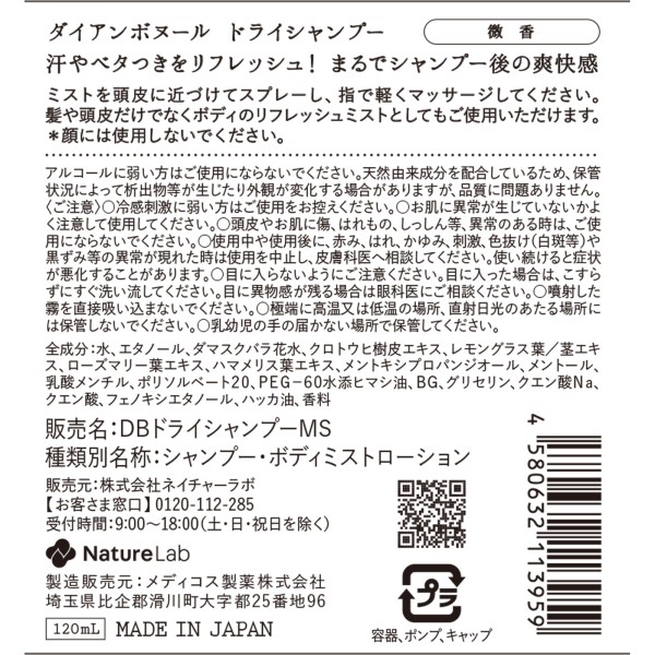 다이안 보뇌르 드라이 샴푸 약향 120ml 네이처 라보 > 기타 드라이 샴푸