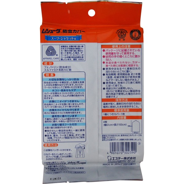 무슈다 방충 커버 1년 유효 의류 방충제 슈트·재킷용 4매 에스테 > 정장·재킷용