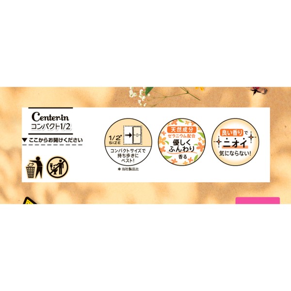 普通のスリムナプキンの1/2※のコンパクトサイズだから、持ち歩きにベスト!※当社製品比 ふっくらと肌にやさしい質感の肌セレブシートを採用。身体のカタチに合わせてフィットする独自構造で、スキマを作らず経血をたっぷり吸収するから、スリムでも安心です。センターインは、少しでも気分が上がるデザインで、身も心も軽やかに過ごせるよう応援します。