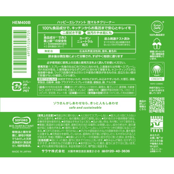 해피 엘리펀트 거품 멀티 클리너 본체 400ml 사라야 > 액체 세제