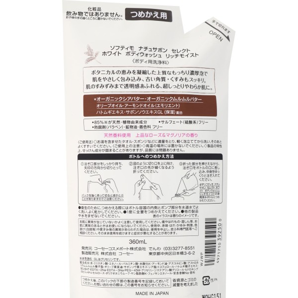 소프티모 나츄 사봉 셀렉트 화이트 바디 워시 리치 모이스트 리필 360ml KOSE 코스메 포트 > 범용(기타)