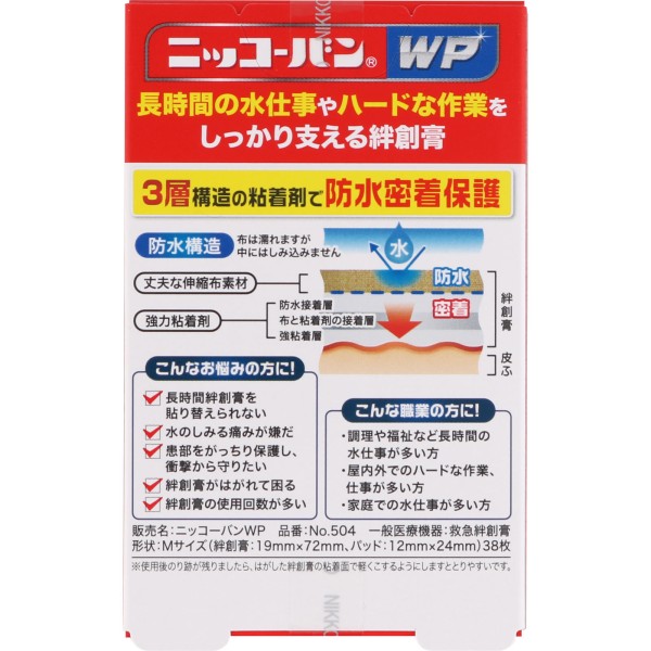 防水構造、強力粘着、丈夫な伸縮布素材で長時間の水仕事やハードな作業に強い、働く人を支える絆創膏です。