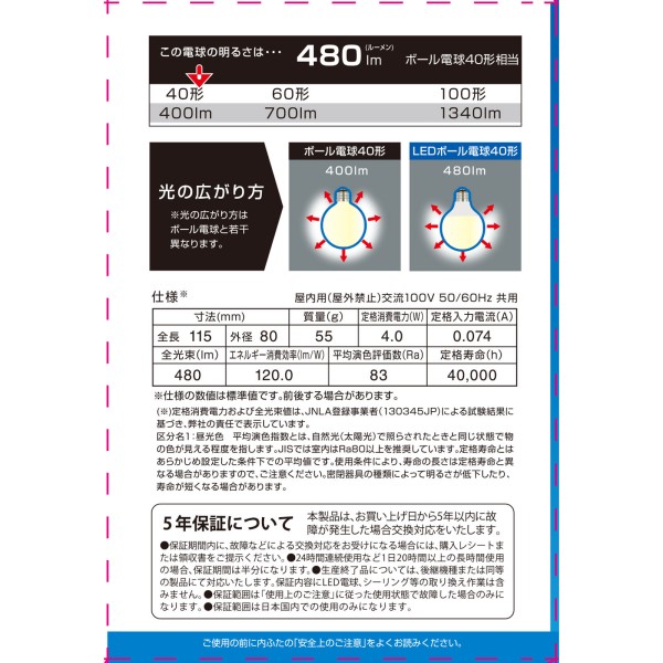 LED볼 전구 40W형 주광색 옴전기 > LED 전구