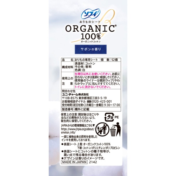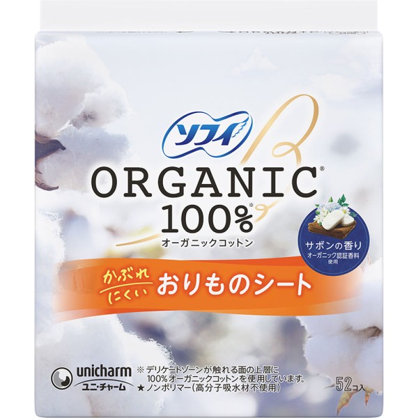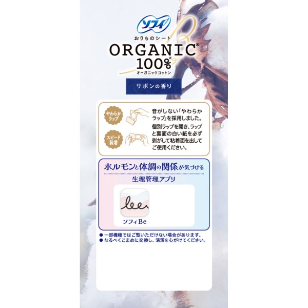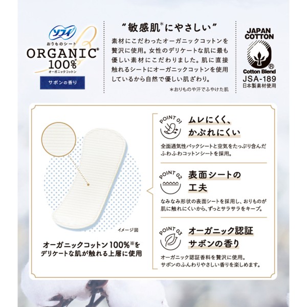オーガニックコットンを使用したおりものシート。やさしいサボンの香り付き。オーガニック認証香料を使用しています。