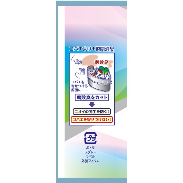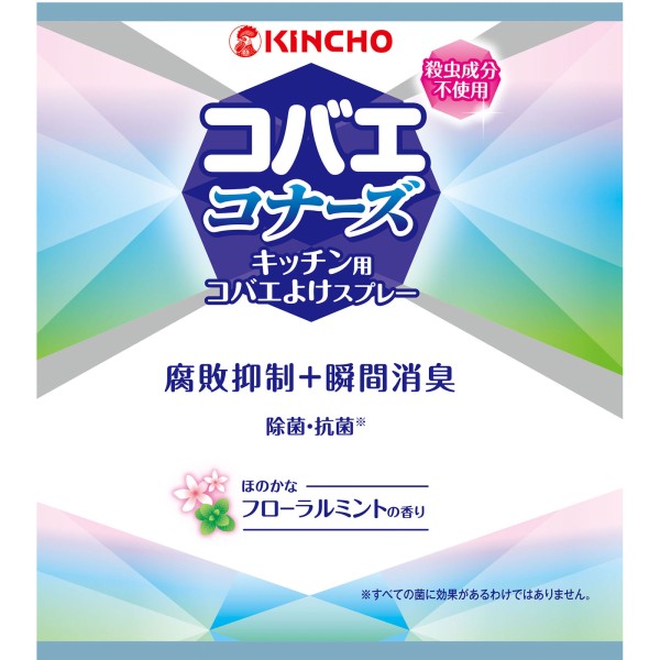 キッチン用コバエよけスプレー。殺虫成分不使用。腐敗抑制+瞬間消臭。除菌・抗菌※(※すべての菌に効果があるわけではありません)。ほのかなフローラルミントの香り。