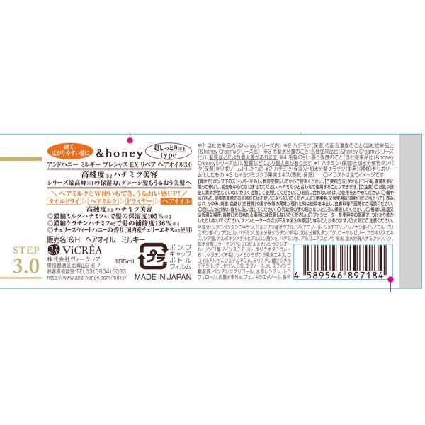 앤드허니 밀키 프레셔스 EX 리페어 헤어오일 3.0 105ml 주식회사 비클레아 > 앤드허니