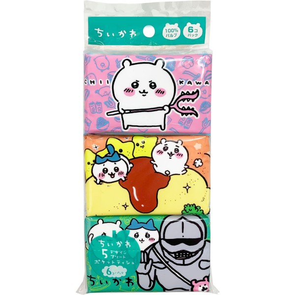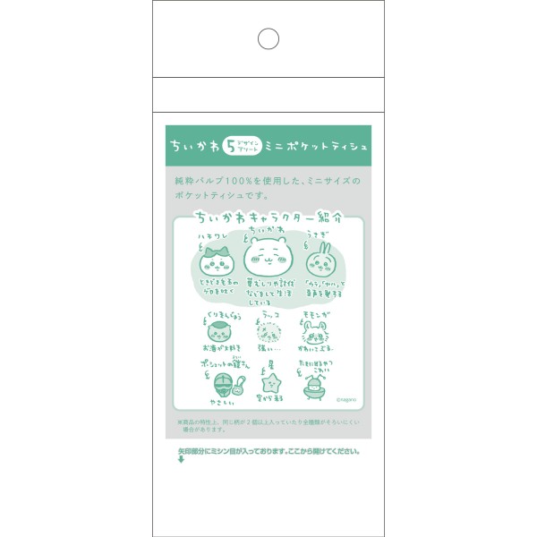 純粋パルプ100%を使用した、今テレビで大人気の「ちいかわ」のミニポケットティシュです。