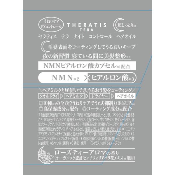 夜を味方につける夜活美容をコンセプトに、製品に美容液成分を90%以上配合※3。NMNヒアルロン酸*1と10種のうねりケア成分*2でうねり髪のお悩み全方位にアプローチ。高保湿成分*3とコーティング成分*4配合で毛髪のうるおいキープ。